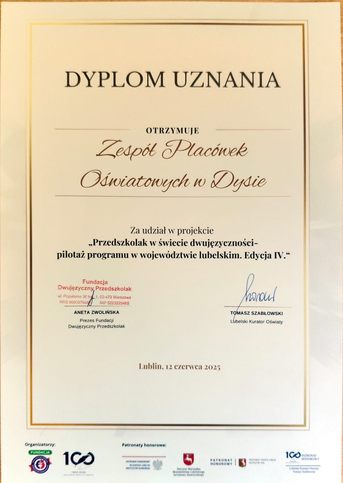 Z radością informujemy, że nasza placówka otrzymała dyplom uznania Kuratora Oświaty w związku z aktywnym udziałem w projekcie „Przedszkolak w świecie dwujęzyczności”.