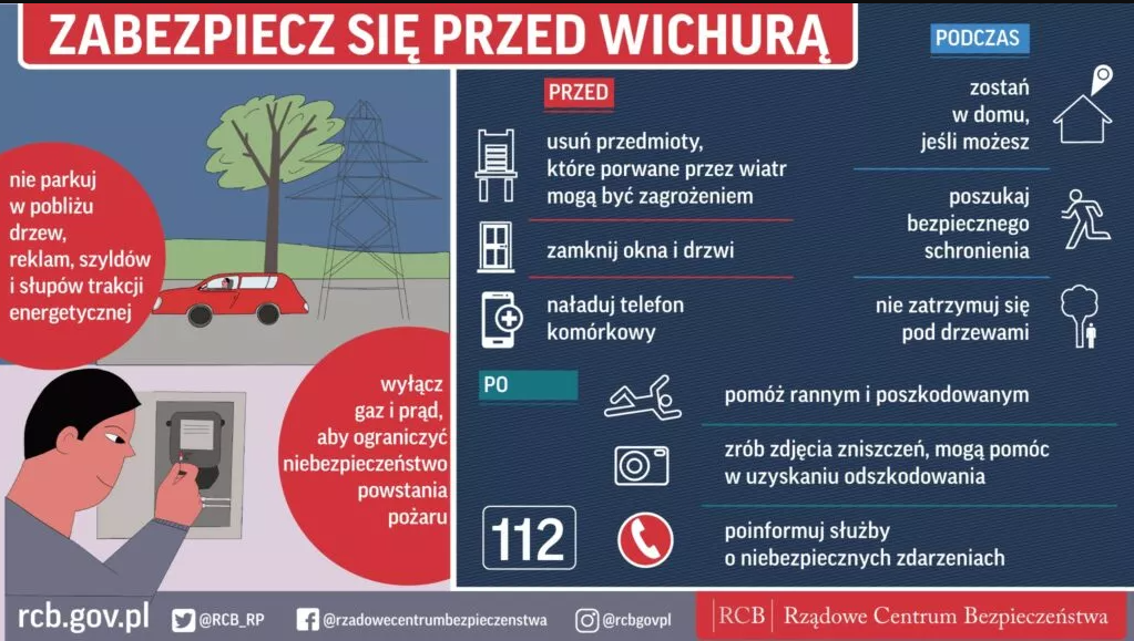 Podczas wichury nie wychodź na zewnątrz (jeżeli nie jest to niezbędne), poszukaj bezpiecznego schronienia; (jeżeli jesteś poza domem) i nie zatrzymuj się pod drzewami.